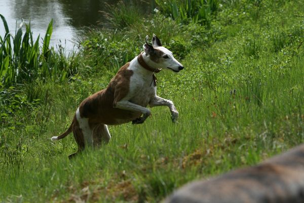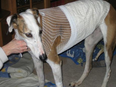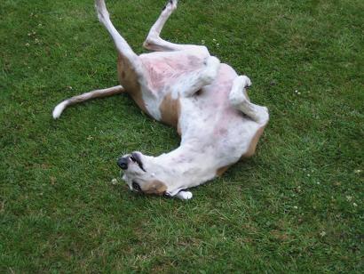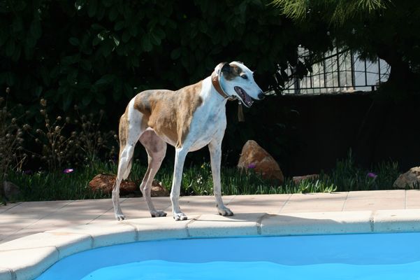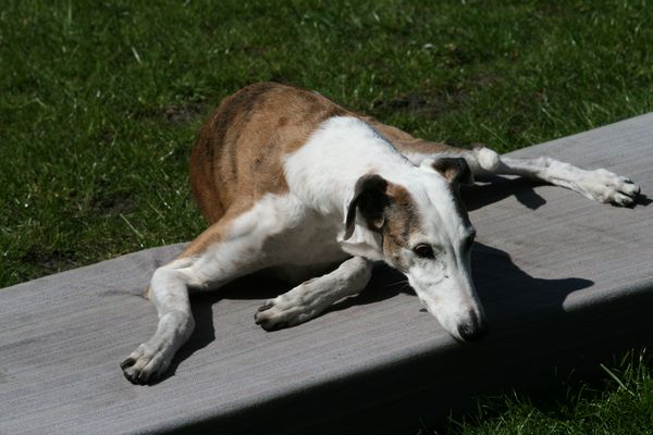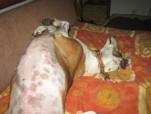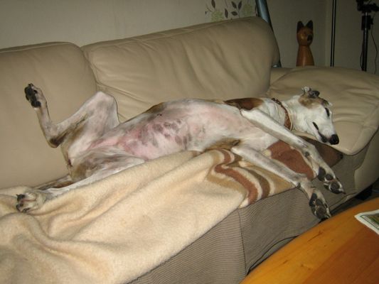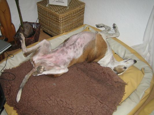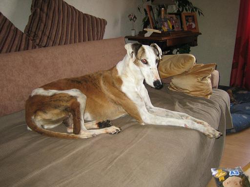 Unsere Sally kam am 24.03.2005 als Pflegehund Lula im Alter von ca. 6 Jahren zu uns. Sie kam urspr. aus der Tötung in Caudete und meine liebe Sole fragte mich, ob ich noch Platz für eine liebe, kleine Galga hätte, die dringend aus Spanien raus müsse. Ich sagte natürlich ja, Nando war ja bereits vermittelt und auf dem Sprung in seine neue Familie. Dann kam Sally an: stinkend, panisch und klein war sie auch nicht. 3 Tage später lag sie bereits in der Klinik weil sich ihre Kastrationsnaht auf dem Transport entzündet hatte. Sie wurde nachgeschnitten und neu genäht. Nach einigen Stunden konnten wir sie entgegen der ersten Ansage der Klinik wieder abholen. Sie war dort so panisch, dass man dann doch unserer Meinung war, dass sie bei uns zu Hause besser aufgehoben wäre. Gerne haben wir sie abgeholt, sie hat sich dann auch zunehmend gut erholt und wurde wieder gesund, einschließlich einer ausgeheilten Ehrlichiose, welche auch in der Klinik diagnostiziert wurde.